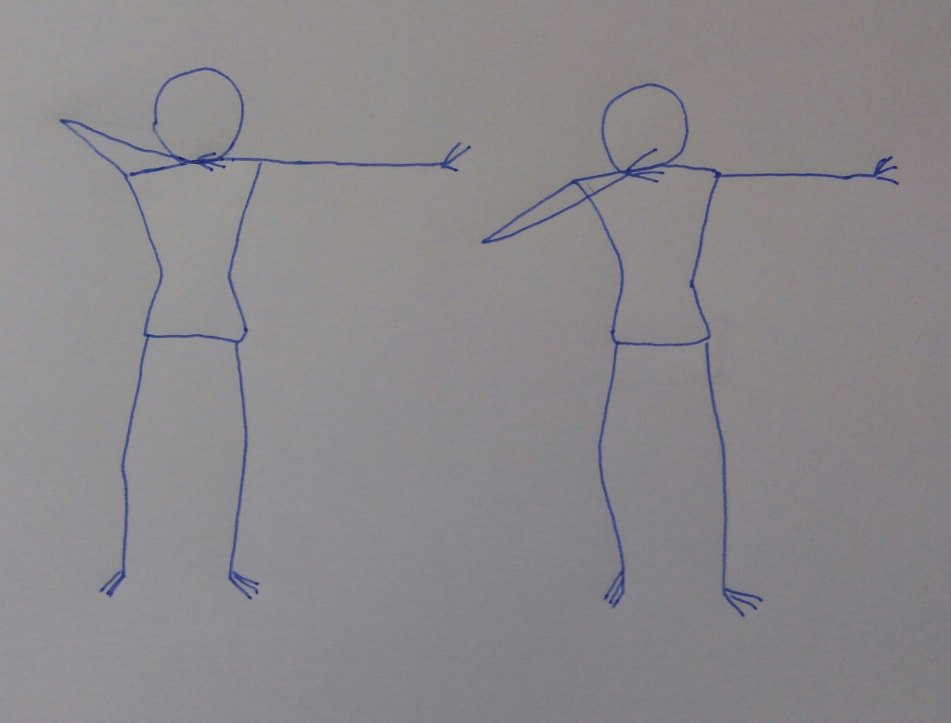 2 >>→◎ セット 両肩の力を抜いてリラックス。お腹やお尻が出ないように、背骨から頭の先までまっすぐ伸ばしましょう。