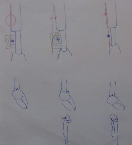 5 >>→◎ ドローイング 押し手は的方向に伸ばしたまま、弦を引きます。引き手のヒジの位置はアゴよりも上に。