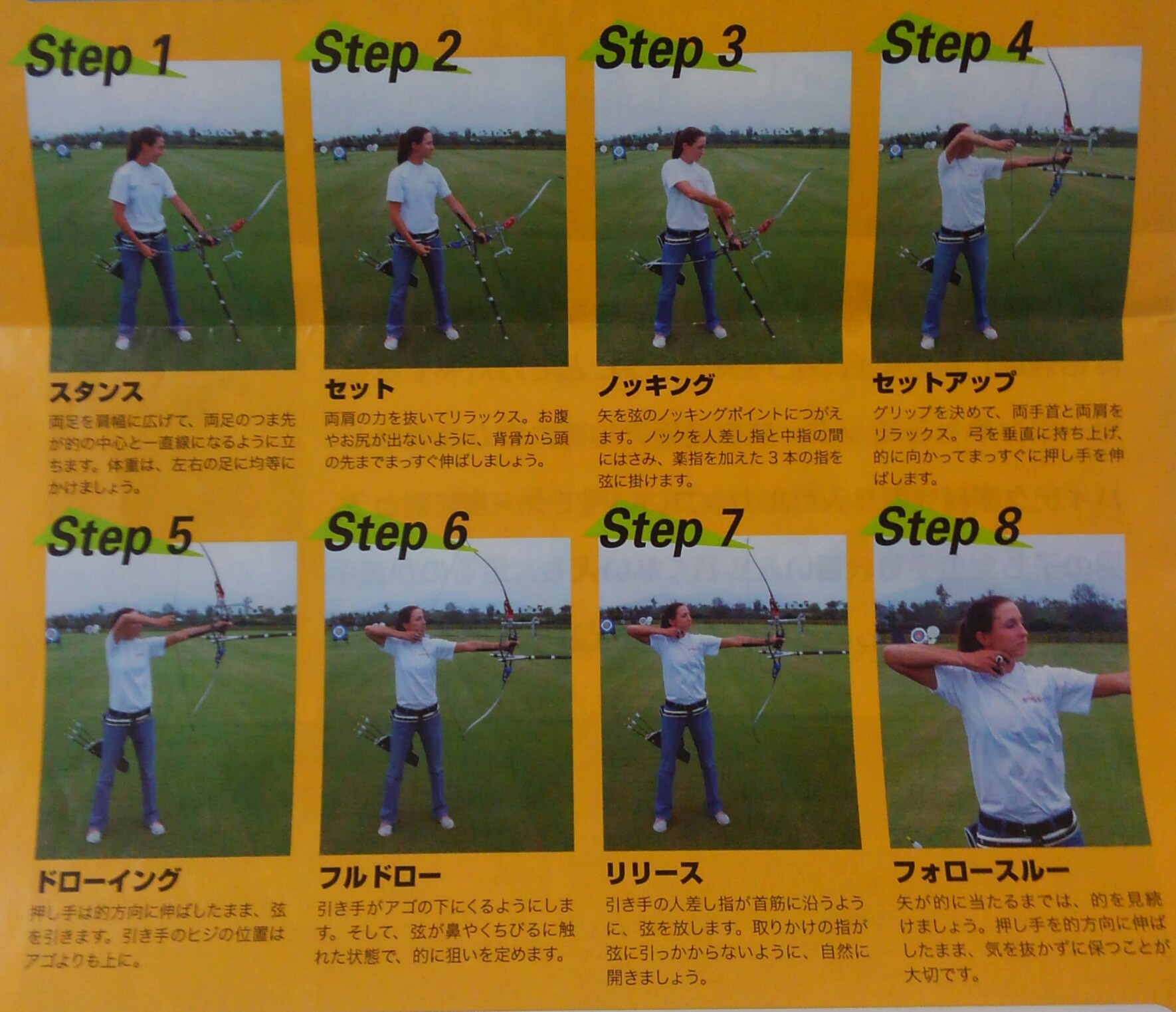 アーチェリーの基本的な射ち方の流れは8ステップから成っています。